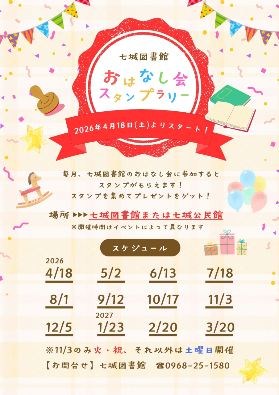・七城図書館以外(中央・泗水・旭志)で開催されるおはなし会は対象外です。