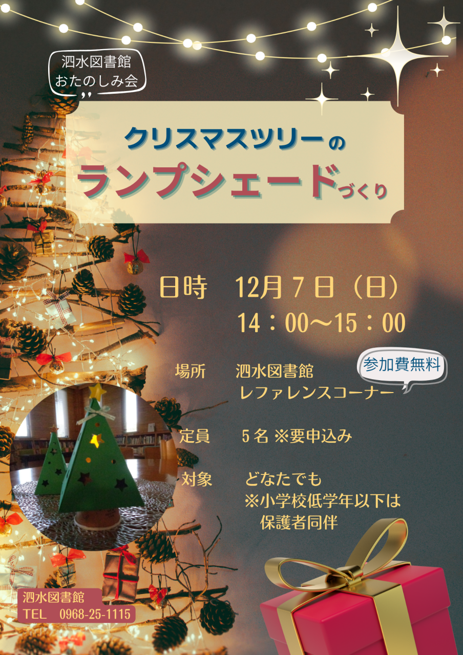 泗水図書館12月のお楽しみ会は、「クリスマスツリーのランプシェードづくり」を行います🎄