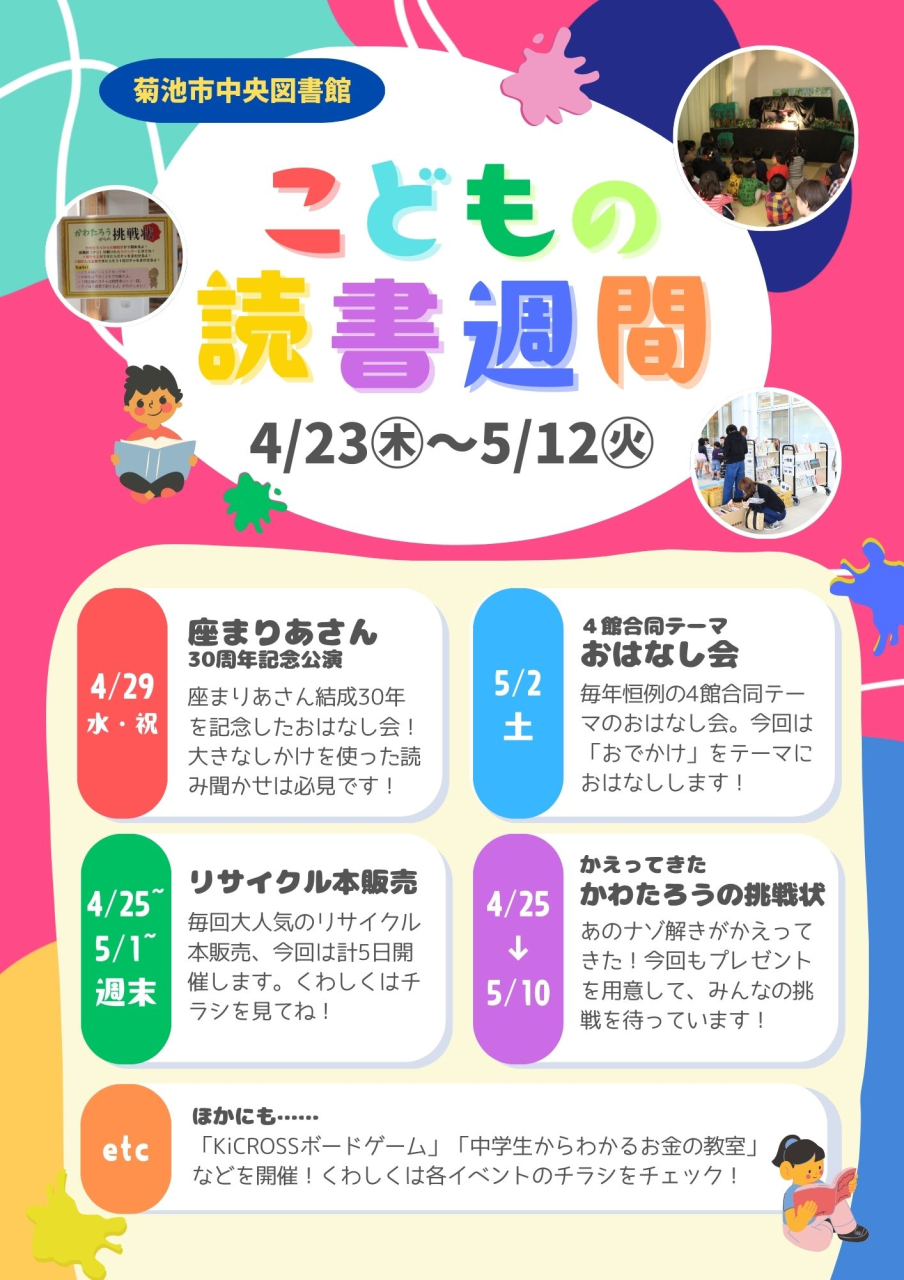 こどもの読書週間は4/23の「子ども読書の日」から始まる、こどもの読書活動を推進する期間です。中央図書館及び菊池市立図書館では期間中、様々なイベントや取り組みをご用意して皆さまをお待ちしています!