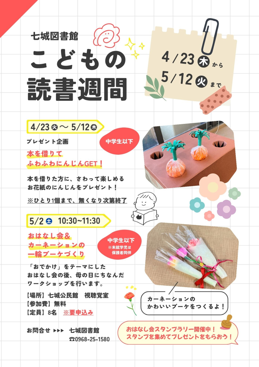 七城図書館では今年もこども読書週間に合わせてイベントを行います!どうぞお気軽にご参加ください🌸