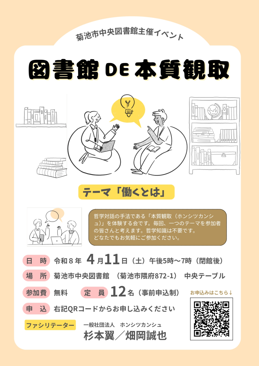 【講師】 杉本翼/畑岡誠也 (一般社団法人ホンシツカンシュ) 【お申込み・お問い合わせ】 チラシに記載されているQRコードからお申込みください。