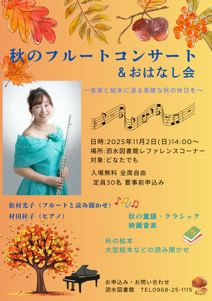 松村光子さんと村田桂子さんをお招きして、「秋のフルートコンサート&おはなし会」を行います🎶