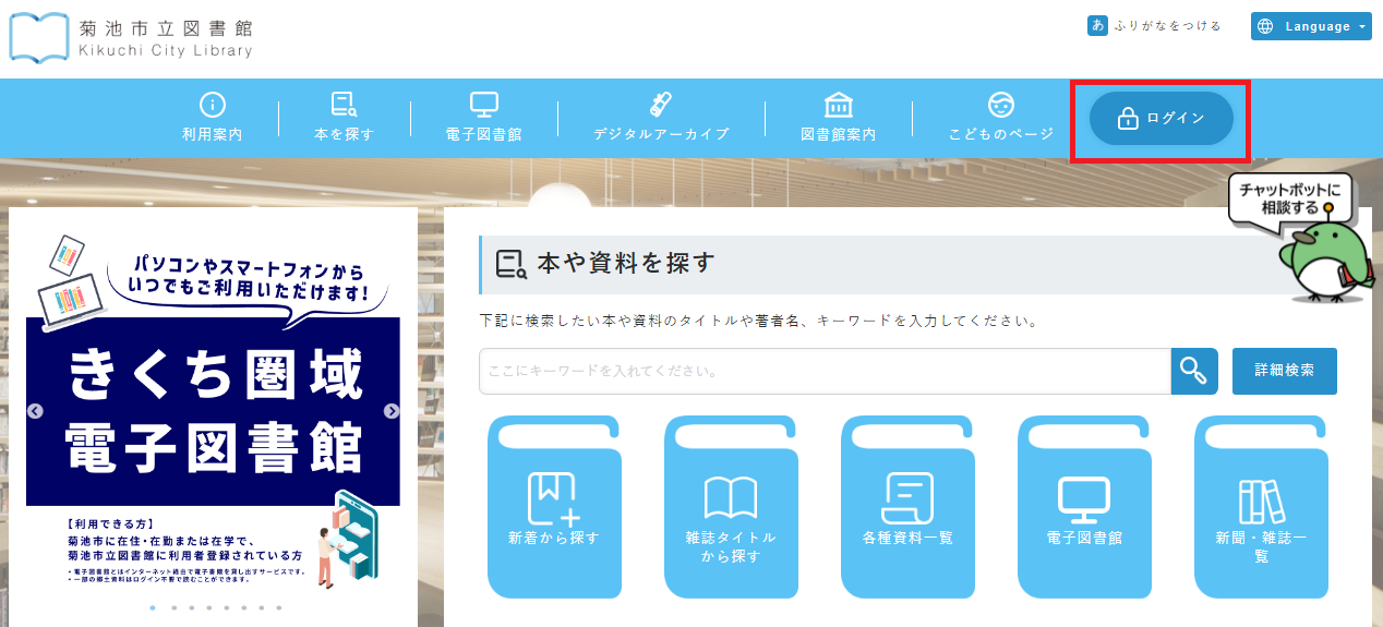 パスワード登録をしていただくと、図書館カード(バーコード)の表示や、利用照会から借りている本の確認、予約している本の一覧を見ることができます。